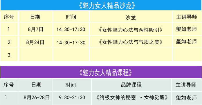 如伊朵女神学院八月份课程表安排出来啦!大家要仔细看收好哦。 【活动地点】深圳市南山区花样年美年广场4栋305【报名方式】编辑短信 “姓名+电话” 发送到15889658333(徐老师)同微信号可直接报名。